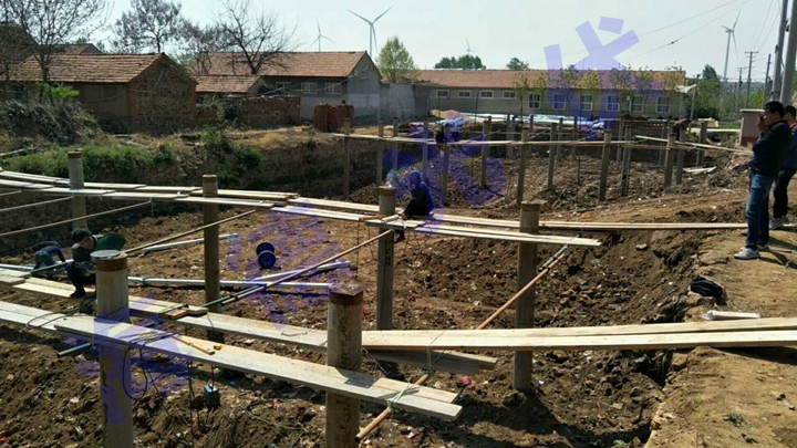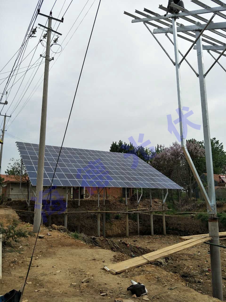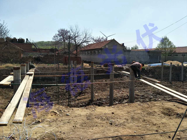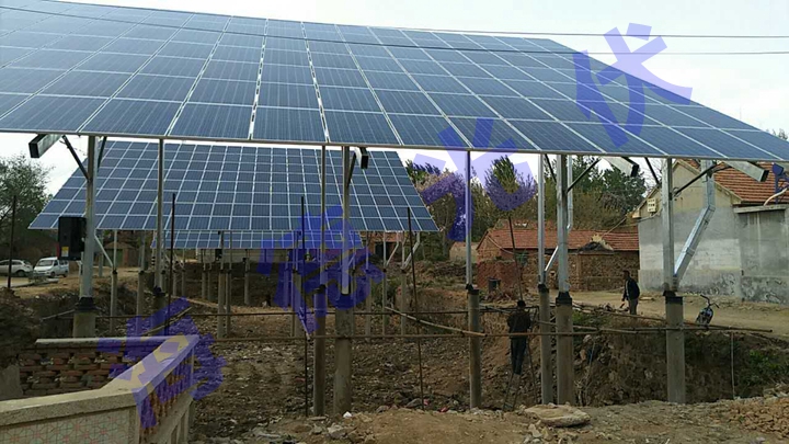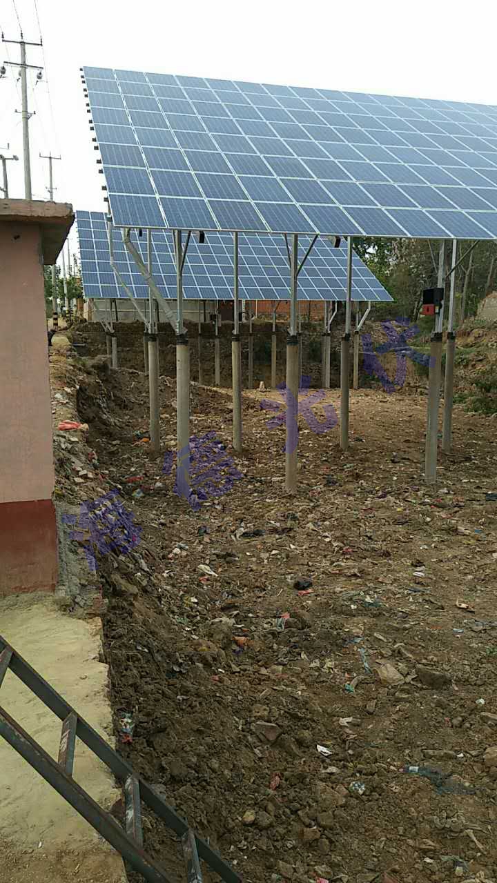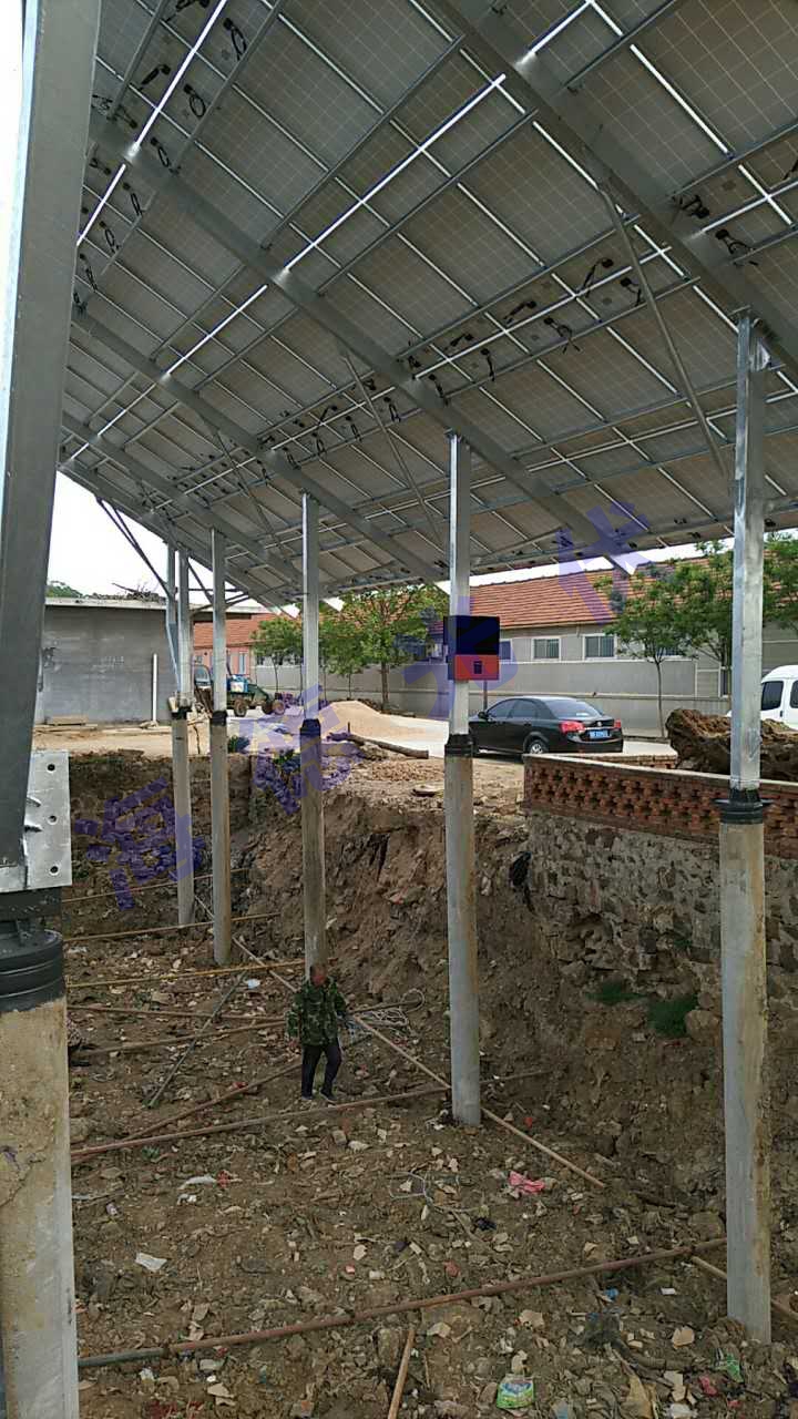 該光伏扶貧工程工地位于一個(gè)廢棄干涸的池塘內(nèi),整個(gè)池塘深度在3米左右。池塘兩側(cè)均為民房,為了防止光伏電站的采光受到兩側(cè)民房的阻擋而影響發(fā)電效果,在設(shè)計(jì)之初,就將整個(gè)光伏電站的高度整體拉高,池塘底部打樁,伸出地上的樁體高度達(dá)到4米,而深入地下的樁體長度同樣達(dá)到4米以上。