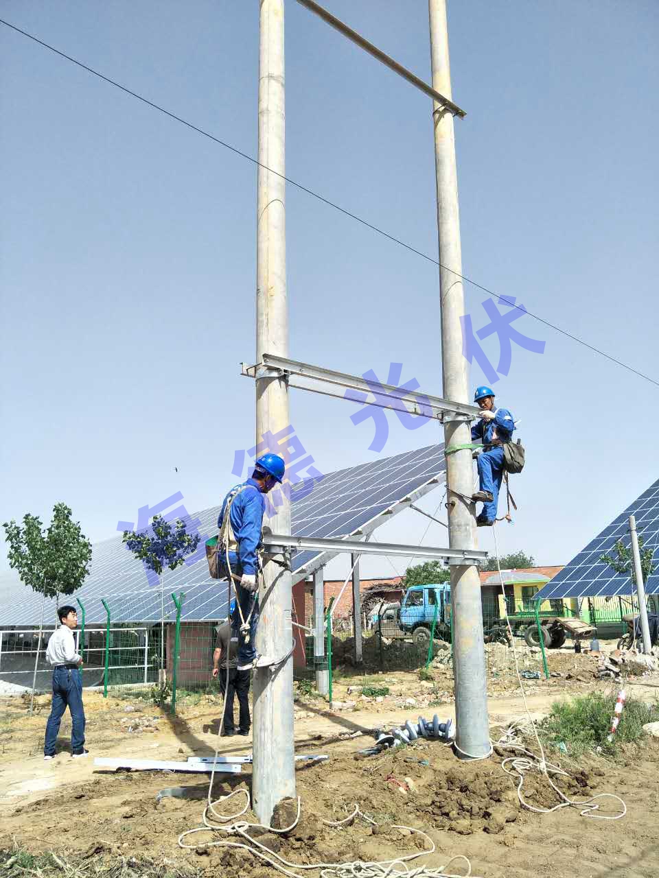 施工人員正在小心翼翼的將電池板安裝加固。我們采用同行業(yè)領先水平的晶體硅光伏組件,采用嚴格的國際標準質(zhì)量管理體系,施行嚴苛的環(huán)境測試,確保我們的光伏組件光電轉(zhuǎn)換穩(wěn)定,使用壽命長久。