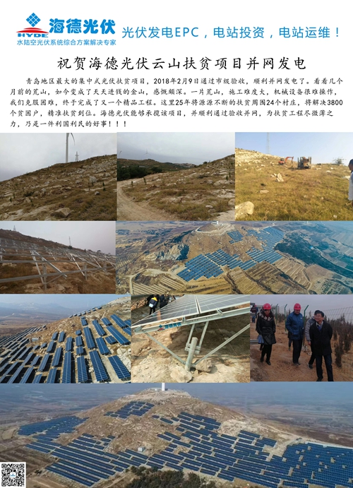 本項(xiàng)目位于平度市云山鎮(zhèn)公家村附近的荒山上,是平度市乃至青島市截至目前安裝規(guī)模最大的村鎮(zhèn)光伏電站扶貧工程。該項(xiàng)目安裝總?cè)萘?/span>1.72MW,占地面積約33000平米,由青島市政府扶貧資金出資建設(shè),項(xiàng)目總計(jì)投資預(yù)算17257244.8元(壹仟柒佰貳拾伍萬柒仟貳佰肆拾肆元捌角整)。