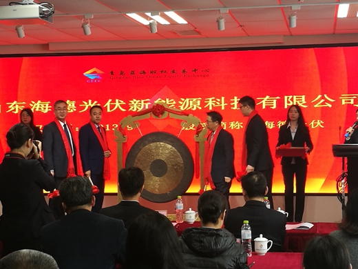 2018年3月28日上午,“2018年嶗山區(qū)企業(yè)區(qū)域性股權(quán)市場掛牌服務(wù)年暨藍(lán)海股權(quán)嶗山企業(yè)專場掛牌啟動儀式”在青島藍(lán)海股權(quán)交易中心隆重召開。伴隨著清脆的敲鑼聲,山東海德光伏新能源科技有限公司在青島藍(lán)海股權(quán)交易中心正式掛牌上市,股權(quán)代碼:801369,股權(quán)簡稱:海德光伏。