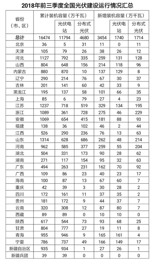 全國(guó)各?。▍^(qū)、市)2018年前三季度光伏建設(shè)運(yùn)行情況詳見附表: