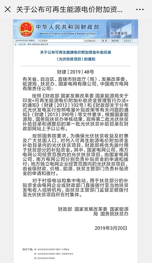 近日,國家財政部、發(fā)展改革委、國家能源局、國務院扶貧辦等四部委聯(lián)合發(fā)布了《關于公布可再生能源電價附加資金補助目錄(光伏扶貧項目)的通知》,并公布了調(diào)整后的全國各省份第一批光伏扶貧補助目錄(包括戶用電站和村級集中電站)以及第二批光伏扶貧補助目錄。