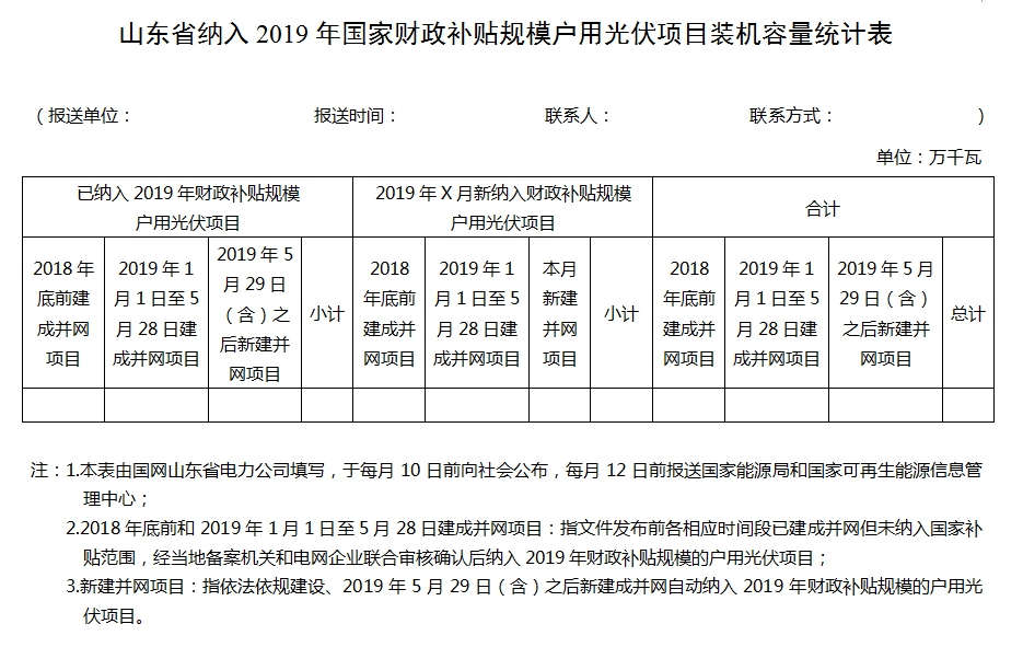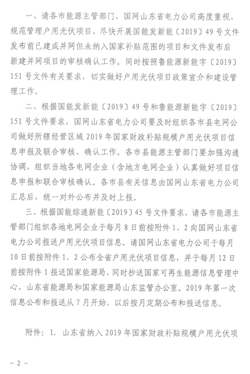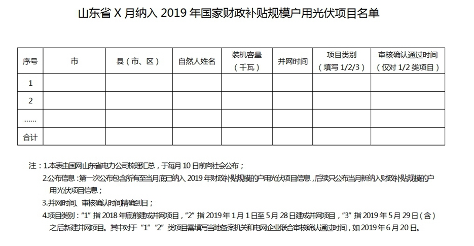 三、根據(jù)國能綜通新能〔201945號文件要求,請各市能源主管部門組織各地電網(wǎng)企業(yè)于每月8日前按附件1、2向國網(wǎng)山東省電力公司報(bào)送戶用光伏項(xiàng)目信息。請國網(wǎng)山東省電力公司于每月10日前按附件1、2公布全省戶用光伏項(xiàng)目信息,并于每月12日前按附件1報(bào)送國家能源局,同時抄送國家可再生能源信息管理中心、山東省能源局和國家能源局山東監(jiān)管辦公室。2019年第一次信息公布和報(bào)送從7月開始,以后按月定期公布和報(bào)送信息。