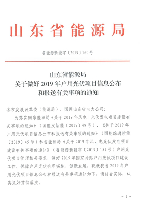 山東省能源局發(fā)布關(guān)于做好2019年戶用光伏項(xiàng)目信息公布和報(bào)送有關(guān)事項(xiàng)的通知 2019-06-24