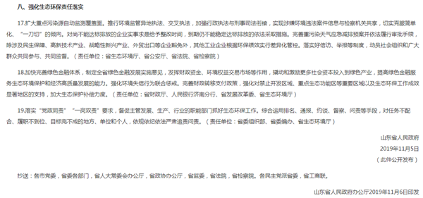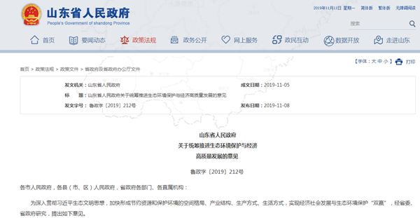 山東省政府發(fā)文《關(guān)于統(tǒng)籌推進(jìn)生態(tài)環(huán)境保護(hù)與經(jīng)濟(jì)高質(zhì)量發(fā)展的意見》 2019-11-13