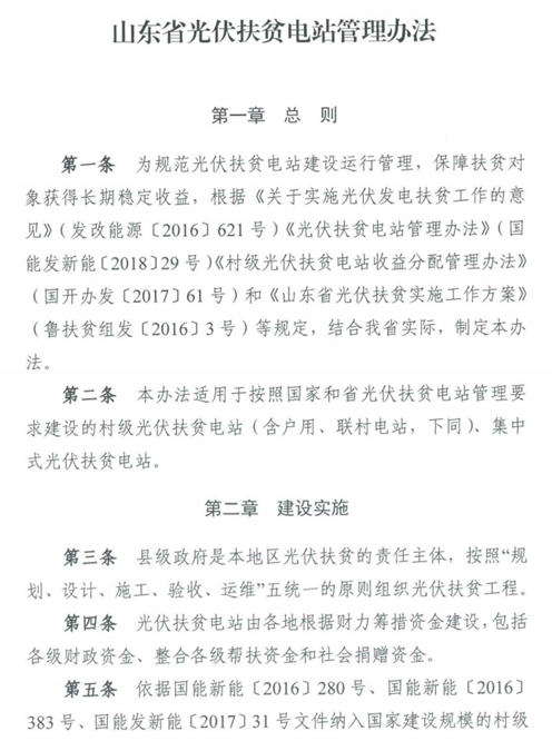 近日,山東省發(fā)改委、山東省能源局、山東省扶貧辦聯(lián)合印發(fā)了《山東省光伏扶貧電站管理辦法》,該辦法適用于按照國家和省光伏扶貧電站管理要求建設的村級光伏扶貧電站(含戶用、聯(lián)村電站)、集中式光伏扶貧電站。