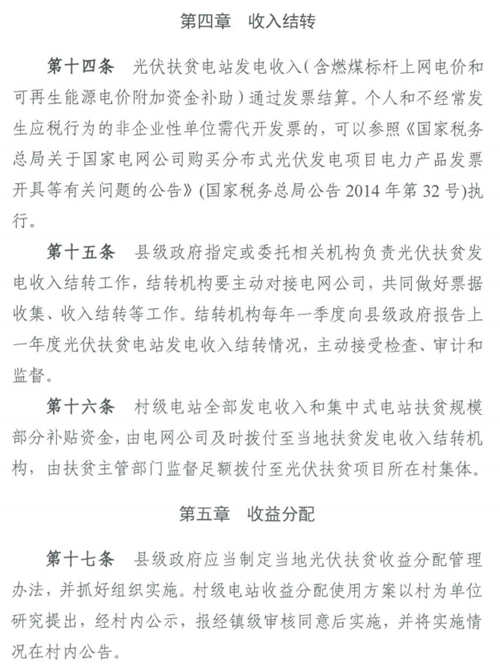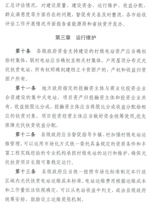 在資產(chǎn)確權上,村級電站資產(chǎn)要確權給村集體,合資建設的集中式電站資產(chǎn)歸政府指定的投融資主體和投資企業(yè)共有,收益按股比分成,投融資主體要將股比分成收益分配給相應的扶貧對象。在收入結轉(zhuǎn)上,村級電站全部收入和集中式電站用于扶貧部分的補貼資金由電網(wǎng)公司撥付到當?shù)亟Y轉(zhuǎn)機構專戶,由扶貧部門監(jiān)督撥付和使用。在收益分配上,縣級政府制定光伏扶貧收益分配管理辦法,并抓好組織實施。各地應當加強光伏扶貧電站收益分配使用的監(jiān)督管理,資金發(fā)放的全流程要保存相關資料,留檔備查。