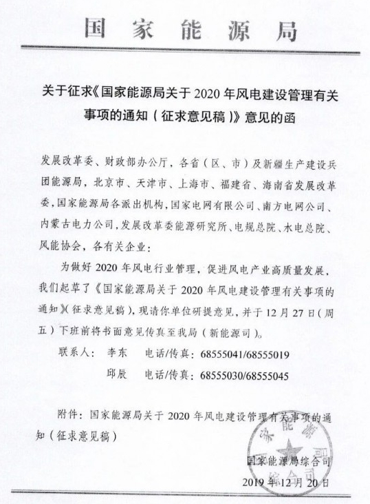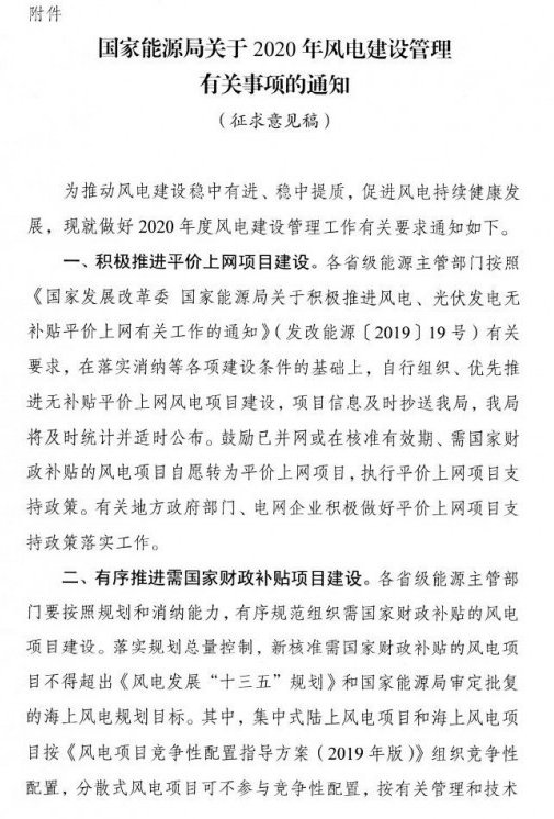 近日,國家能源局下發(fā)《關(guān)于征求2020年風(fēng)電建設(shè)管理有關(guān)事項(xiàng)的通知(征求意見稿)的函》,就2020年風(fēng)電建設(shè)管理政策,向相關(guān)主管部門、機(jī)構(gòu)、企業(yè)廣泛征求意見。