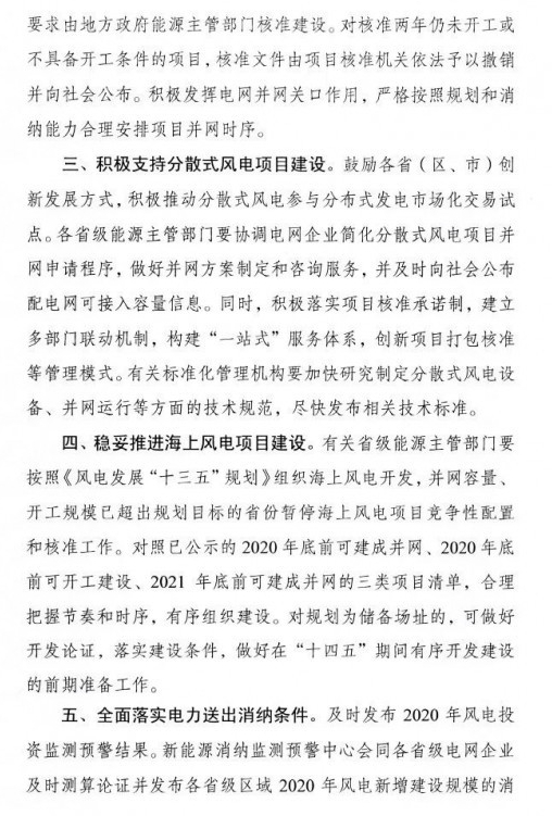 《征求意見函》顯示,2020年將積極推進(jìn)平價上網(wǎng)項(xiàng)目建設(shè)。各省級能源主管部門在落實(shí)消納等各項(xiàng)建設(shè)條件的基礎(chǔ)上,可自行組織、優(yōu)先推進(jìn)無補(bǔ)貼平價上網(wǎng)風(fēng)電項(xiàng)目建設(shè)。積極支持分散式風(fēng)電項(xiàng)目建設(shè)。鼓勵各?。▍^(qū)、市)創(chuàng)新發(fā)展方式,積極推動分散式風(fēng)電參與分布式發(fā)電市場化交易試點(diǎn)。穩(wěn)妥推進(jìn)海上風(fēng)電項(xiàng)目建設(shè)。并網(wǎng)容量、開工規(guī)模已超出規(guī)劃目標(biāo)的省份暫停海上風(fēng)電項(xiàng)目競爭性配置和核準(zhǔn)工作。