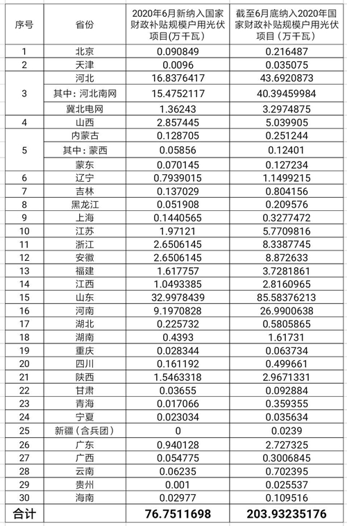納入2020年國家財政補(bǔ)貼規(guī)模戶用光伏項目裝機(jī)容量統(tǒng)計表