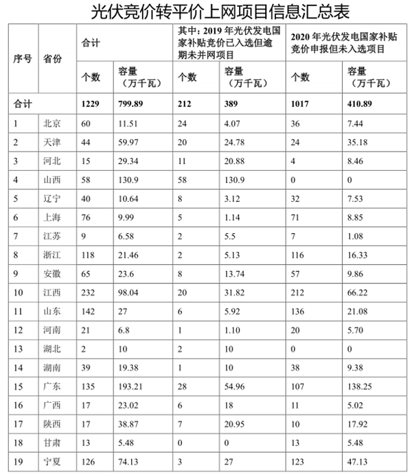 近日,國家能源局相關(guān)部門發(fā)布通知,公布光伏競價轉(zhuǎn)平價上網(wǎng)項目信息統(tǒng)計情況,經(jīng)統(tǒng)計,全國光伏競價轉(zhuǎn)平價上網(wǎng)項目共1229個,裝機規(guī)模799.89萬千瓦。