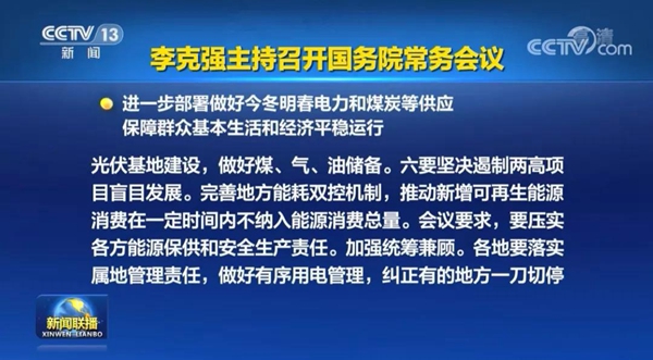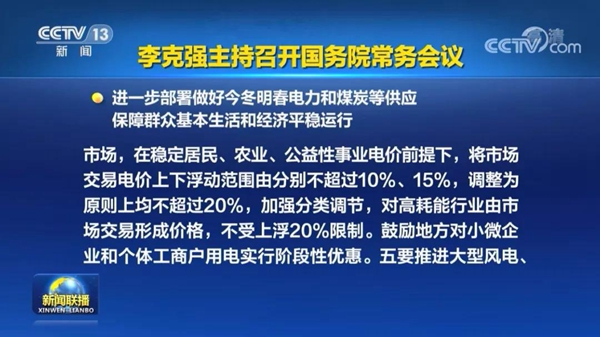 據(jù)央視《新聞聯(lián)播》報道:國務(wù)院總理李克強在10月8日的國務(wù)院常務(wù)會議上提出:將市場交易電價上下浮動范圍由分別不超過10%、15%,調(diào)整為原則上均不超過20%,加快推進沙漠戈壁荒漠地區(qū)大型風(fēng)電、光伏基地建設(shè)。進一步部署做好今冬明春電力和煤炭等供應(yīng),保障群眾基本生活和經(jīng)濟平穩(wěn)運行等。