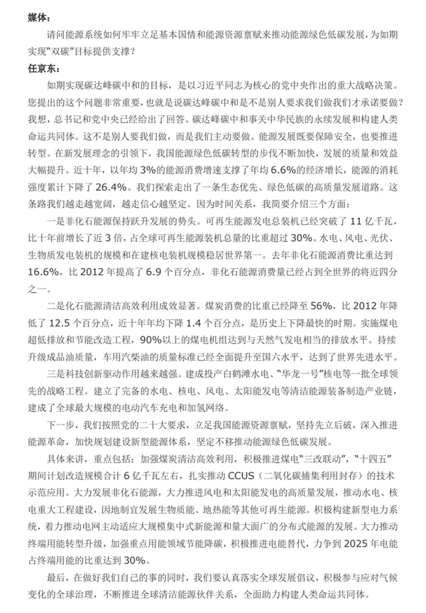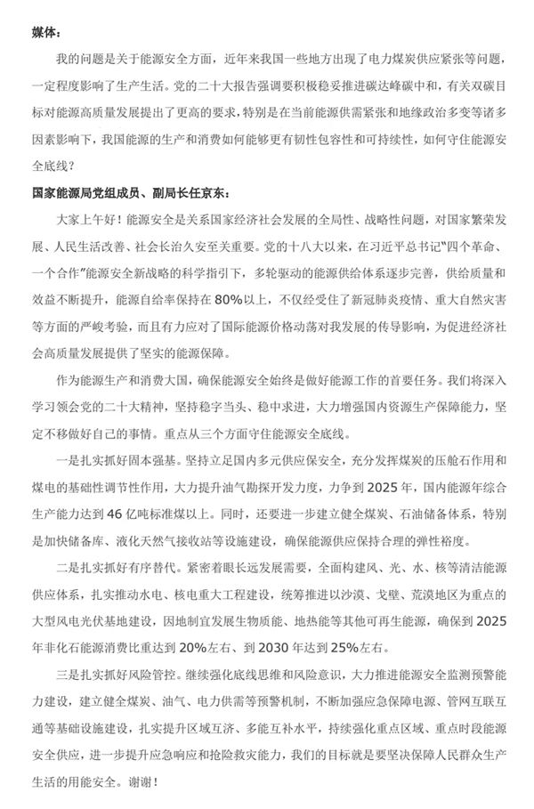 10月17日上午, 二十大新聞中心內(nèi),國家能源局黨組成員、副局長任京東在記者招待會上,介紹了貫徹新發(fā)展理念、構(gòu)建新發(fā)展格局、推動高質(zhì)量發(fā)展,以中國式現(xiàn)代化全面推進(jìn)中華民族偉大復(fù)興有關(guān)情況,并回答記者提問。
