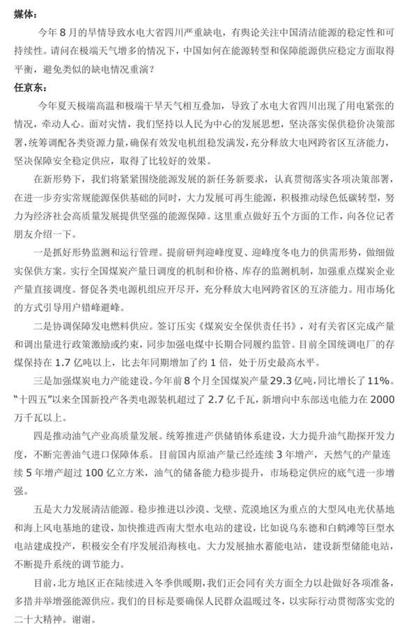 任京東提出,大力發(fā)展清潔能源。穩(wěn)步推進(jìn)以沙漠、戈壁、荒漠地區(qū)為重點(diǎn)的大型風(fēng)電光伏基地和海上風(fēng)電基地的建設(shè),加快推進(jìn)西南大型水電站的建設(shè),比如說烏東德和白鶴灘等巨型水電站建成投產(chǎn),積極安全有序發(fā)展沿海核電。大力發(fā)展抽水蓄能電站,建設(shè)新型儲能電站,不斷提升系統(tǒng)的調(diào)節(jié)能力。
